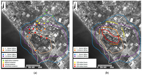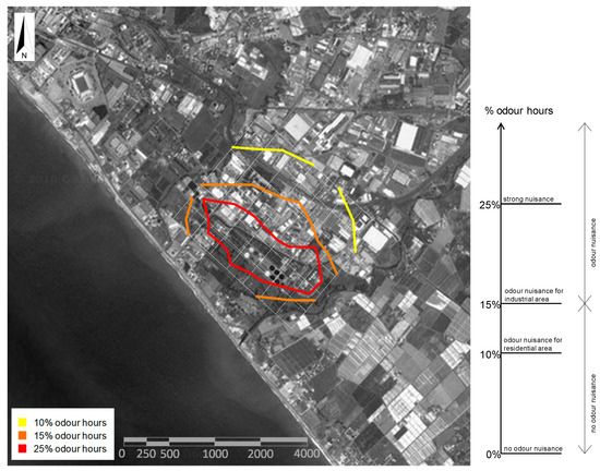 The odor frequency in terms of “odour hours” (nh), assessed in the 42 assessment squares, was represented graphically through isofrequency odour maps, generated by means of the kriging interpolation geostatistical method, performed using the Surfer software [39]. Four isofrequency levels were performed in the study to analyse the odour nuisances: nh < 10%, no odour nuisance; 10% ≤ nh < 15%, odour nuisance for residential area; 15% ≤ nh < 25%, odour nuisance for industrial area; nh ≥ 25%, strong nuisance [40].