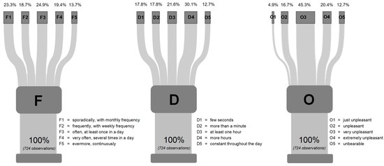 Of the 1000 total recorded individual observations, 226 questionnaires (22.6% of the total observations) report not having perceived odours of the wastewater treatment quality or not having perceived odours in the area. Figure 4 summarizes the results of the collected data of the persons that perceived WWTP odours, related to the part of the questionnaire which dealt with the frequency (F), duration (D) and offensiveness (O) of odours.