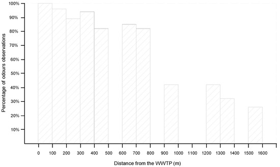 The results show that the odours emitted from the WWTP are perceived in their immediate surroundings. However, a decrease of the perception of the odour is detected upon increasing the distance from the plant. At distances greater than 800 m, there is a drastic drop in the number of interviewees who declare to have perceived WWTP odour.
