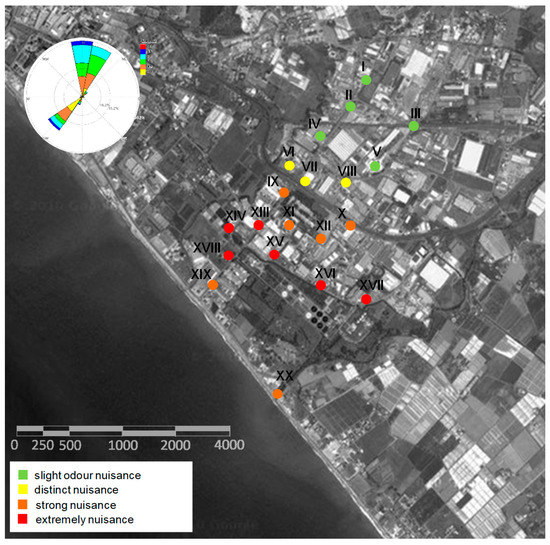 Figure 6 shows the odour nuisance level assumed for each investigated point. The level was defined by calculating the Odour Annoyance Index (OAI) using all the collected data over the monitoring period.
