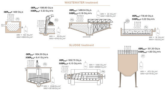 In terms of odour concentration, the highest values were detected at the sludge thickening (55′109 OUE/m3) while the lowest in the oxidation unit (18 OUE/m3). Similarly, by analysing the odour emission rate data (OER), on the basis of the values of maximum specific odour emission rate (SOERmax (i = 1–8)) calculated over the whole analysis period, the treatment of thickening of the sludge highlights the maximum value (1′934.3 OUE/s).