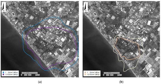 The isopleths relevant to a higher percentile (98th percentile instead the 85th percentile), as well as the use of a lower odour concentration threshold (1.0 OUE/m3 instead of 1.5 OUE/m3) confirm to be a more conservative approach, in accordance with other studies [5,49] in terms of odour nuisance identification, covering generally a larger area. In the identification of the odour annoyed area by the atmospheric dispersion model application, it is possible to note that it has a greater influence on the variation of the considered percentile compared to the variation of the hourly peak concentrations of the odour threshold. At the same time, it can be seen how the prevailing meteoclimatic conditions monitored in the area (see wind rose in Figure 6) produce a greater impact on the shape of the isopleths, adopting a lower percentile for their calculation.