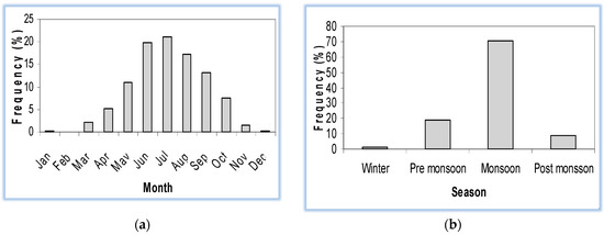 The monthly and seasonal percentage of the total annual rainfall from 1948 to 2017 have been shown in Figure 1. The highest percentage of the total annual rainfall (21.1%) is observed in the month of July (Figure 1a). Besides, the percentage of the total annual rainfall is relatively high in June (19.93%), August (17.14%), and September (13.05%). On the other hand, the percentage of the total annual rainfall (0.08%) is lowest in February (Figure 1a). There are mainly four seasons in Bangladesh—winter (December–February), pre-monsoon (March–May), monsoon (June–August) and post-monsoon (October–November). Seasonally, the highest percentage of the total annual rainfall (70.6%) is observed in monsoon and lowest (1.4%) in winter (Figure 1b). Pre-monsoon and post-monsoon contribute 20% and 8% of total respectively (Figure 1b).