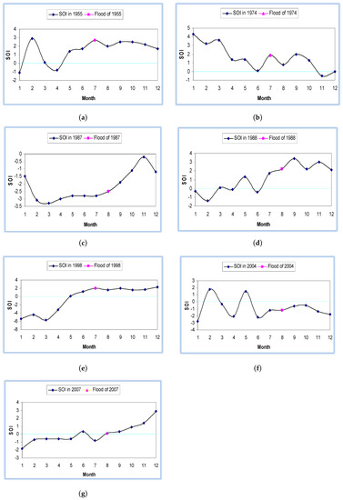 A flood occurred during July–August in 1955 which inundated 34.20% area of Bangladesh and SOI indicates positive value in this time, as a result La Niña was prominent in that period (Figure 2a). La Niña (Figure 2a,b,d,e) was also prominent in 1974 (inundated about 36.6%), 1988 (inundated about 60%), 1998 (maximum inundated ~68% area of Bangladesh) and floods occurred in monsoon period (July–August). On the other hand, El Niño (Figure 2c,f) was also prominent in 1987 (inundated about 40%) and 2004 (inundated about 38%), respectively. A flood in 2007 (inundated about 42%) was recorded under neutral phase of ENSO (Figure 2g).