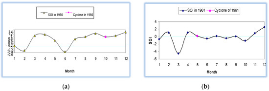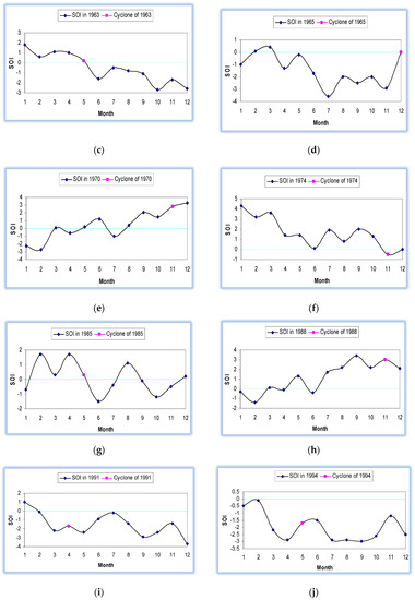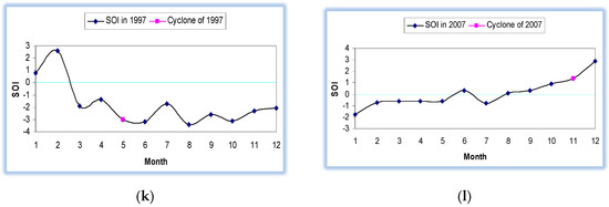 Twelve severe cyclonic storms with hurricane speed (on the basis of maximum wind speeds) were identified (Table 3). La Niña (Figure 3a,e,h,l) was prominent in 1960 (wind speed 193 km/h), 1970 (wind speed 193 km/h), 1988 (wind speed 193 km/h), and 2007 (wind speed 193 km/h). On the other hand, El Niño (Figure 3i,j,k) was also prominent in 1991 (wind speed 225 km/h), 1994 (wind speed 200 km/h), and 1997 (wind speed 230 km/h), respectively. Rest five TCs 1961 (wind speed 161 km/h), 1963 (wind speed 202 km/h), 1965 (wind speed 184 km/h), 1974 (wind speed 161 km/h), 1985 (wind speed 154 km/h) were under neutral phase of ENSO (Figure 3b–d,f,g).