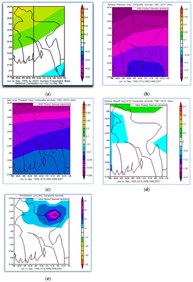 Synoptic conditions (a) surface precipitable water, (b) surface pressure, (c) sea level pressure, (d) surface runoff, and (e) precipitation anomaly) during La Niña.