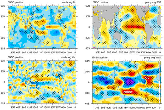 Relative humidity, sea surface temperature, vorticities, and vertical wind shear anomalies during ENSO positive/La Niña phase. Blue (Yellow, Red, and Pink) shade represents negative (positive) units. Dot points indicate >5% significance level.