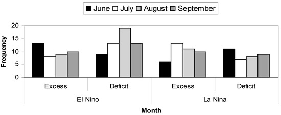 In an El Niño event, excess rainfall is seen in July and deficit is observed in August–September and during the La Niña event, the excess rainfall is observed in July–September (Figure 7). Floods occurred during July–September and the flooding years of 1955, 1974, 1988, 1998, and 2007 were found under La Niña and 1987, 2004 were in El Niño. About 5 floods were interlinked with excess rainfall and La Niña event whereas 2 floods were under the deficit rainfall and El Niño event. So, the excess and deficit of rainfall are not always responsible for a flood occurrence in Bangladesh.