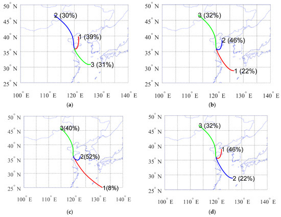 Three-day backward trajectories arriving in Qingdao (36.0° N, 120.0° E), China, computed at 0, 6, 12, 18 UTC (i.e., 8, 14, 20, 2 (2nd day) local time) for every day during a 4-year period (2015–2018) were used. The four moments every day were selected to increase the number of trajectories. Four years of daily trajectory sets were used as input to the different clustering algorithms at three different arrival heights (10, 100, and 500 m above the ground). These arrival heights were selected by referencing Kassomenos et al. [12] for increasing the datasets, each of which refers specifically to the set of all trajectories reaching each height in each year.