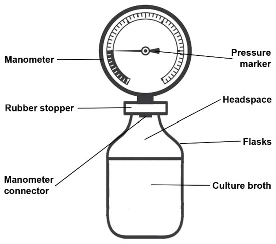 The pressure gauges were connected to the flasks through the rubber stopper. With the aid of a tweezers previously sterilized in dry heat, the sterile rubber caps were punctured (1 to 2 mm) in their central region and later attached to the manometer connector (5 mm). The glass vials containing the previously prepared culture media were uncapped next to a lamp flame in order to avoid contamination, and immediately the cap attached to the prepared manometer was connected to the mouth vial. After setting up each instrument, the leak test was performed. Using a 10 mL syringe attached to a needle, 10 mL of air was introduced into the syringe plunger in order to observe the pressure increase in the system. This pressure was maintained for 60 s to analyze possible air leaks and consequently the pressure loss. Instruments that did not show pressure loss during the tests were used.