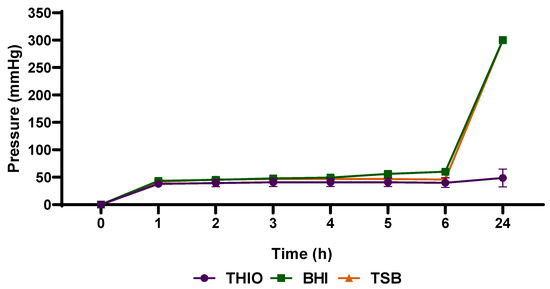 To determine the best culture broth and detect the presence of bacteria by pressure variation, preliminary tests were necessary. The results depicted in Figure 2, using Enterobacter cloacae ATCC 13,047 revealed no significant differences in pressures between the culture media used during the first 4 h (p > 0.05). Between 5 and 6 h, a significant pressure increase was observed in BHI broth in response to the production of gases inside the flasks when compared to the other evaluated broths (TSB and THIO) (p < 0.05). Moreover, a significant increase in pressure was observed in BHI and TSB, and both presented pressures of 300 ± 0 mmHg (maximum pressure that the device can detect) after 24 h, when compared with THIO broth (p < 0.05). These results demonstrate that, although all the broth media tested are excellent culture media for the recovery of microorganisms, BHI and TSB were considered the most efficient in terms of gas production.
