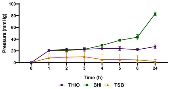 According to the data depicted in Figure 4, pressures varied substantially over time during analyzes using BHI flasks. The highest pressure found in bottles without microorganisms was 40 mmHg between 2 and 6 h and the lowest pressure was 42 mmHg between 21 and 24 h. These results were already expected due to physicochemical changes related to temperature, pressure and gas solubility. The positive pressures observed over time are related to the events of vaporization of the contents of the culture medium. The flasks, before being incubated in a bacteriological oven, exhibited a pressure of 0 mmHg shortly after preparation at room temperature. Inside the microbiological oven at a temperature of 35 ± 2 °C, the constituent molecules of the broth cause agitation as a result of thermal energy transfer [42]. As a result, the vaporized molecules in the headspace collide with the walls of the flasks, generating force evidenced by the increase in intra-flask pressure. More volatile substances present in the intra-vial content can also flow quickly, from liquid to gaseous [43].