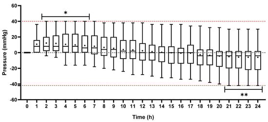 Analysis of the pressure distribution in blood culture flasks containing only BHI broth and 0.9% NaCl solution for 24 h. The data are presented in mean (+) and interquartile range. The lower and upper box-plot rods represent the minimum and maximum pressures, respectively. *: maximum positive pressure measured during the experiment. **: maximum negative pressure measured during the experiment.
