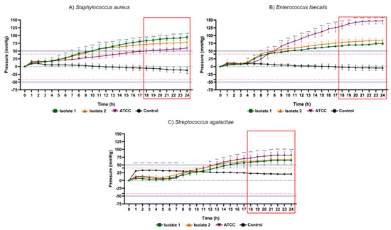Results of 24 h pressure gauge curves of Staphylococcus aureus (A), Enterococcus faecalis (B) and Streptococcus agalactiae (C) in culture flasks with BHI broth compared to the control (BHI culture medium). Data are expressed as mean ± standard deviation of the mean. Significant difference in relation to the control: * p < 0.05, ** p < 0.01 and *** p < 0.001 (ANOVA and Tukey’s test). Black dotted line: pressure 0 mmHg on the y axis. Dotted lines in red: maximum positive pressure (40 mmHg) and maximum negative pressure (−42 mmHg). Solid blue lines: (50 mmHg) and minimum (−52.5 mmHg) of pressure for positive test. Red rectangle: time-to-positivity (TTP).