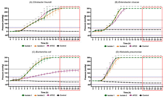 Results of the 24 h pressure gauge curves of Citrobacter freundii (A), Enterobacter cloacae (B), Escherichia coli (C) and Klebsiella pneumoniae (D) in culture flasks with BHI broth compared to the control (BHI culture medium). Data are expressed as mean ± standard deviation of the mean. Significant difference in relation to the control: ** p < 0.01 and *** p < 0.001 (ANOVA and Tukey’s test). Black dotted line: pressure 0 mmHg on the y axis. Dotted lines in red: maximum positive pressure (40 mmHg) and maximum negative pressure (−42 mmHg). Solid blue lines: (50 mmHg) and minimum (−52.5 mmHg) of pressure for positive test. Red rectangle: time-to-positivity (TTP).