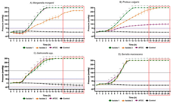 Results of the 24 h pressure gauge curves of Morganella morganii (A), Proteus vulgaris (B), Salmonella spp. (C) and Serratia marcescens (D) in culture flasks with BHI broth compared with the control (BHI culture medium). Data are expressed as mean ± standard deviation of the mean. Significant difference in relation to the control: * p < 0.05, ** p < 0.01 and *** p < 0.001 (ANOVA and Tukey’s test). Black dotted line: pressure 0 mmHg on the y axis. Dotted lines in red: maximum positive pressure (40 mmHg) and maximum negative pressure (−42 mmHg). Solid blue lines: (50 mmHg) and minimum (−52.5 mmHg) of pressure for positive test. Red rectangle: time-to-positivity (TTP).