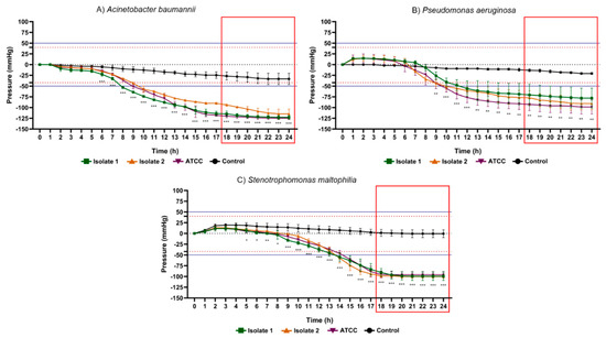 Results of the 24 h pressure gauge curves of Acinetobacter baumannii (A), Pseudomonas aeruginosa (B) and Stenotrophomonas maltophilia (C) in culture flasks with BHI broth compared to the control (BHI culture medium). Data are expressed as mean ± standard deviation of the mean. Significant difference in relation to the control: * p < 0.05, ** p < 0.01 and *** p < 0.001 (ANOVA and Tukey’s test). Black dotted line: pressure 0 mmHg on the y axis. Dotted lines in red: maximum positive pressure (40 mmHg) and maximum negative pressure (−42 mmHg). Solid blue lines: (50 mmHg) and minimum (−52.5 mmHg) of pressure for positive test. Red rectangle: time-to-positivity (TTP).