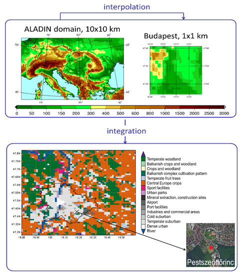 Flow chart about the use of SURFEX. Upper panel: domain and orography of the 10 km resolution ALADIN-Climate and its selected part covering Budapest, for which model fields are interpolated to 1 km resolution. Lower panel: land cover types according to the ECOCLIMAP database for the Budapest domain. Black X marks the closest gridpoint to the considered station measurement, which is also shown on orthophoto on the lower left corner (Google Earth image).
