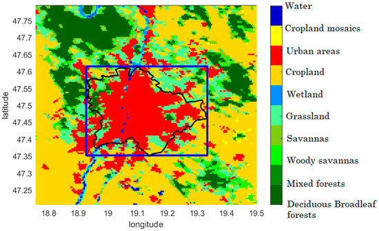 Land-use types for Budapest metropolitan area based on MODIS Land Cover Products. Blue rectangle represents the area that was considered for computing the SUHI affected area.