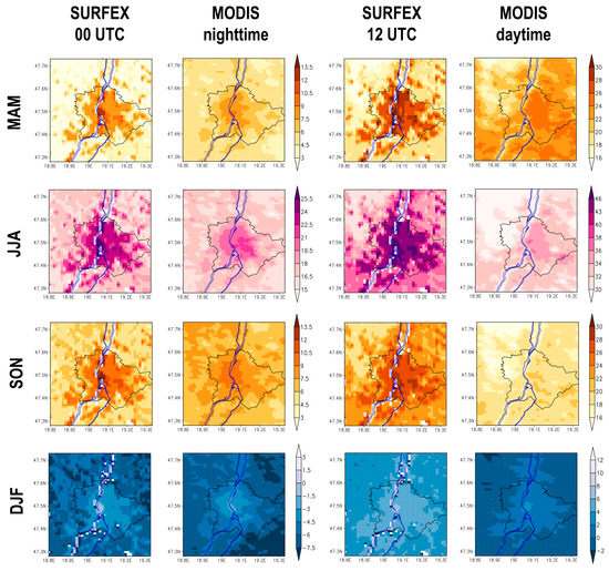 First, SURFEX simulations at 0 and 12 UTC–representing nighttime and daytime cases–were considered and compared with measurements of the Aqua satellite. Note that the measurements happen 30 min earlier around noon and 43 min later at night. We analyzed the seasonal mean daytime and nighttime LST and its variability to investigate how SURFEX is able to describe the spatial and temporal distribution of surface temperature over the urban and rural areas.