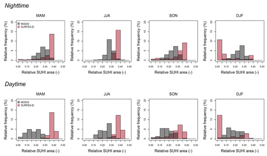 The SUHI-affected area was investigated and validated following the method of Zhang and Wang [47]. Figure 5 shows the seasonal distribution of the relative area of SUHI affected gridpoints (the sum of the gridpoints where ) over the city of Budapest. In MODIS at night the histograms are skewed left in each season except winter (when it is rather symmetric) with the most frequent values of 25–30%. The general overestimation of SUHI extent in SURFEX is obvious, because except winter the histogram is shifted towards the larger values. The most frequent SUHI area is between 35–40%, which occurs in the great majority of time in spring and summer. However, in winter, the histogram of SURFEX has a bimodal shape and most often the SUHI area is below 5%, therefore in this season MODIS shows a more developed SUHI area. At daytime, SURFEX shows a similar distribution to nighttime results both in the shape and most frequent SUHI relative area. While the histogram of observed value portrays different shape than at nighttime, because they are rather symmetric except summer (when it is skewed left). The most frequent areas are 10–30% that is lower than of SURFEX again. In winter the same can be observed, SURFEX underestimates the SUHI affected area. Based on this analysis we can conclude that there is much smaller variability in the SUHI affected area in SURFEX both at day and at night in all seasons compared to MODIS measurement.