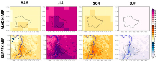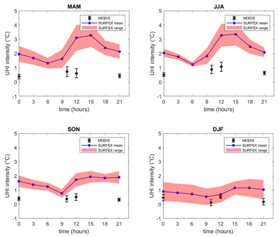 Finally, the seasonal mean daily cycle of SUHI is shown in Figure 6. It is obvious that besides the general overestimation in SURFEX, there is a much larger intraday variability in LST compared to MODIS, especially in spring and summer. SUHI varies between 1 °C and 4 °C in spring and summer, 0.5 °C and 2 °C in autumn and 0.5 °C and 1 °C in winter in SURFEX, while in MODIS it does not exceed 1.5 °C in any seasons. The best agreement is found in winter at 12 and 0 UTC compared to the Aqua results.