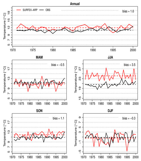 Annual and seasonal 2 m temperature (°C) of SURFEX-ARP in the suburban gridpoint and of the suburban station (Pestszentlőrinc) between 1971 and 2000. The 30 year average is marked with dashed lines and the mean bias indicated in the upper right corner.