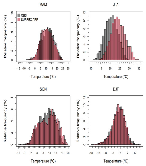 Histogram of daily 2-m temperature (°C) in each season according to SURFEX-ARP and station measurement in 1971–2000.