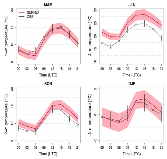 Seasonal mean daily cycle of 2 m temperature (°C) according to SURFEX (red line) and observation (black line with dots). The pink area and the black vertical lines represent the standard deviation computed from the yearly values. Period: 1971–2000.