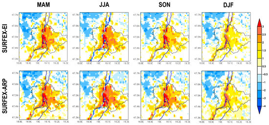 Finally, the two experiments are compared on a common period (1996–2005) from the aspect of simulating UHI. Figure 11 presents the seasonal mean UHI at 0 UTC in SURFEX-EI and SURFEX-ARP. The differences are not large between the two simulations, however the GCM driven model gives stronger temperature surplus (with 0.1–0.2 °C) over the city than its reanalysis driven counterpart. Note that the differences for the 2-m temperature are much higher (e.g., the 2 m temperature bias is 1.1 °C and 2.5 °C for SURFEX-EI and SURFEX-ARP, respectively, compared to CarpatClim-HU over Budapest; not shown), but the subtraction in UHI eliminates the great majority of the systematic bias.