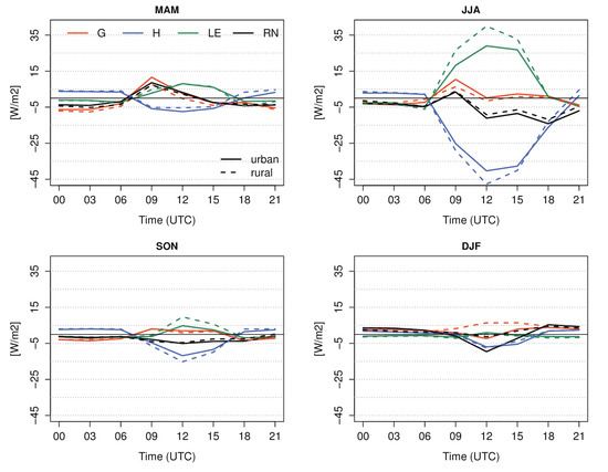 Finally, the seasonal mean diurnal cycle of SUHI and its variability was studied. SURFEX results were compared to all four measurements of Aqua and Terra, and SUHI was computed in the following way: in every timestep and in every gridpoint the LST was subtracted from the mean rural temperature. The mean rural temperature was determined as the average temperature of pure rural grid cells according to ECOCLIMAP in SURFEX and IGBP in MODIS.