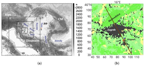 Figure 1b), which extends approximately 40 km in the NE–SW direction with a width of 10 km, reaching the highest peak at 1035 m asl. About 20 km southward from Medvednica is Zagreb Airport (45.73° N, 16.06° E; 108 m asl), located in the lowland region near the Sava river, which is rich with underground waters and mostly covered by grass and small forests. The configuration of a steep slope in Medvednica mountain with flat foothills open to the centre of the basin makes of it an ideal location for the study of the initial stages of mountain–plain interaction, benefiting from the presence of a permanent meteorological station at the airport.