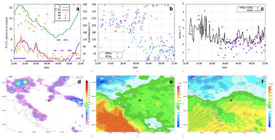 Figure 3d–f), the wind at Zagreb Airport is from the southern sector, probably of mesoscale origin, as the sodar indicates a very weak low-level jet blowing from SE under a SW flow above. There is no hint of arrival of gravity flows from Medvednica at any level. The Sc layer covers the sky with its base at 300 m agl, and in the evening (from 15 UTC), the cloud base approaches gradually the ground until it becomes fog (at 23 UTC), which will remain until 11 UTC the next day.