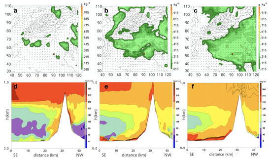 Figure 4c,f), the fog continues extending as far as 20 km from the mountain, while its depth increases with the depth of the downslope flow.