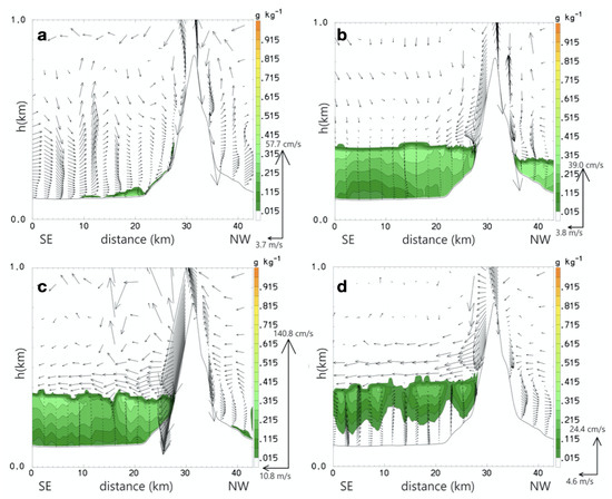 Figure 5a–d. A downslope flow develops at late afternoon over the Medvednica slopes. At 17 UTC, a shallow gravity flow is present over the lower slopes blowing under the general SW wind in clear skies according to the model. However, at 19 UTC, as the ABL temperature decreases, the whole layer becomes saturated and well-mixed by turbulence of mechanical origin, establishing a 300 m deep fog layer which behaves like a Sc but in contact with the ground, covering most of the lower areas. The observations describe the same situation but the cloud is not reaching the ground until 23 UTC.