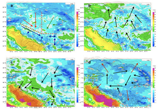 Figure 6d). This is the result of the outflow through the main passes at the four corners (Kvarner at SW, Montenegro at SE, Transcarpathia at NE, and the Bratislava region at NW), with the loss of ABL air having to be compensated by subsiding air coming from aloft.