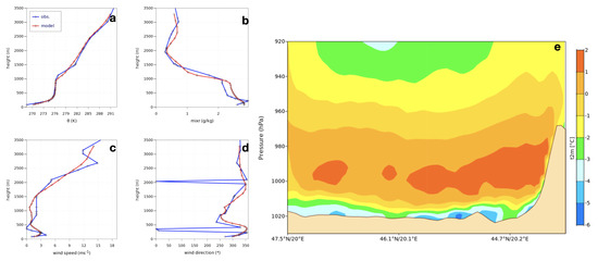 Figure 7e) indicate the lack of pressure gradient, the dominancy of weak local winds, and distinct thermal areas in the Alföld and Transylvania. Inspection of the vertical cross-sections along the Tisza river down to the Dinarides (not shown), indicate that the vertical structure of wind and temperature is similar all along the line.