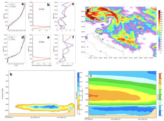 Figure 9a–f show that at the beginning of the event (22D), the fog extends as high as the LLJ, indicating that it is this structure that contributes to this formation. When the fog is mature (23D) it has become deeper, having a stronger thermal inversion at its top, and with contradictory information between the model and the radiosounding concerning the LLJ, the former having the maximum speed at the top of the cloud. These features are very similar to the ones found in the foothills of Medvednica by Zagreb, where the first night the LLJ was generating the fog, and the second night the gravity flows blew above the cloud, causing an increase of its depth by entrainment. Therefore, we find similar mechanisms in the centre of the plain, far from the mountain ranges.