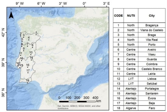 The study area of interest is the five NUTS II regions of mainland Portugal: North, Center, Lisbon Metropolitan Area, Alentejo and Algarve (Figure 1). Besides assessing HDD, CDD and HDD + CDD for Portugal, the second objective of this study is to analyze climate change’s impacts in each NUTS II region. This territory has the two largest urban areas in the country, Lisbon Metropolitan Area, with a population of 2,821,876 inhabitants (28% of the total Portuguese population) [] and the urban area of Porto in the North, with over 1,700,000 inhabitants (17% of the total Portuguese population) [].