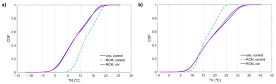 The observational data was extended by GCM projections, covering a period between 1971 and 2070. Bias correction was applied to the original variable’s simulations using the observational data as a baseline climate (1971–2000) referred to as ‘obs, control’ in Figure 3. The E-OBS datasets and the respective GCMs that have a coarser spatial resolution on 0.11° regular grid overlap thus allowing this bias correction. In this study, we used the quantile-quantile bias correction. This method assumes that the distribution function of a variable may change in the future. However, this methodology allows the correction of the complete distribution, tails included. Further details regarding this methodology can be found in Viceto et al. []. Bias correction was applied to daily mean, minimum (Figure 3a) and maximum temperatures (Figure 3b) for the entire study region. Figure 3 shows the respective cumulative distribution functions (CDFs) represented by the application of this bias correction methodology for the historical period (1971–2000), for both Tx and Tn, by projecting the distribution of the observed Tx and Tn (obs, control) onto the simulated Tx and Tn (RCM, control). Afterwards, Tx and Tn are biased corrected for all periods (RCM, cor). All variables were biased corrected, and an ensemble-mean of seven state-of-the-art RCMs (Table 1) was used to compute the HDD and the CDD.