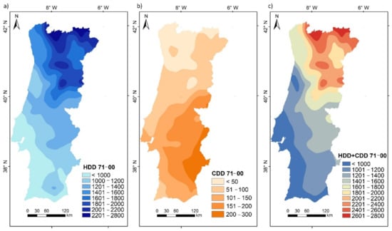 - An assessment of the spatial distribution of the historical baseline climate 1971–2000 was made by the map based on the OK interpolated ensemble-means of HDD, CDD and HDD + CDD (Figure 5). Results show increasing higher HDD values towards the north-eastern regions (with values between 786 and 2755 °C × D per year), contrasting with the spatial distribution of CDD. This indicator, Figure 5b, shows a longitudinal contrast with increasing higher values in inner central to southern Portugal with values ranging from 9 °C × D per year in the vicinity of the coastal areas and mountains to 239 °C × D per year. These results point out a stronger influence of oceanity-continentality factors when comparing with HDD (Figure 5a), for which a latitudinal contrast is evident. Results also show that HDD(CDD) is higher(lower) in mountainous regions hinting at major(minor) energy demand to residential heating(cooling). The latitudinal and longitudinal gradients for HDD and CDD depicted are in clear accordance with the results attained by Spinoni et al. [].
