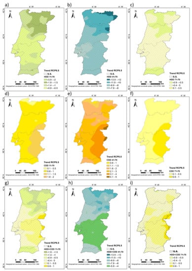 - Projected statistically significant trends in heating or cooling degree days per year (at a 5% significance level) were analyzed within each time-period and for the three indicators. The predicted negative trends of HDD for Portugal are significantly larger (absolute values) for 2041–2070 under RCP8.5 (Figure 9b) than under RCP4.5 (Figure 8b). These statistically significant HDD trends are more pronounced towards North for all periods, although with greater expression for 2041–2070 where values range from −13.5 to −6 °C × D per year under RCP8.5 and −9.9 to −2 °C × D per year under RCP4.5. Though statistically significant for the entire territory, between 2011–2070 and 1971–2070 these HDD linear trends are smaller(higher) in comparison with the 2041–2070 under RCP4.5(RCP8.5). Findings show that these trends’ overall spatial distribution points to a decrease of energy demand to heat internal environments in Portugal though higher in the northern-eastern regions, most significant under RCP8.5 (Figure 9a–c). Despite the methodological differences, these results are in clear accordance with the magnitude of the European Environmental Agency’s trends that can be consulted in the following website https://www.eea.europa.eu/data-and-maps/figures/projected-linear-trend-in-heating (accessed on 18 January 2021).