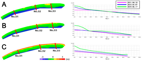 To understand the general topographical changes of the targeted ocean over time, the coastal topography and bathymetry along Haeundae Beach’s surf zone (width ~100–120 m) were investigated to analyze the evolution of Haeundae Beach over the years from 2011, 2014, and 2019. For the topography of sandy beach, the Virtual Reference Station method, which is a real-time kinematic surveying technique, was conducted over an area of 1.4 km in length and 2 m in depth [9], and for the ocean bathymetry, a detailed sea floor topographical survey was conducted using a multibeam echo sounder. This equipment uses the swath coverage method. Each measurement covers tens of multiple times of the water depth and uses the Seabat 7125 Multibeam Sonar, which has a frequency of 200 kHz with 256 beams. The beach profiles were observed and recorded at 50 m intervals, and among them, three specific beach profiles showing the most critical differences were compared, as shown in Figure 2. By comparing these bathymetry surveys near the surf zone from 10 April (2011), 7 May (2014), and 17 June (2019), it was found that the overall depth and bathymetry had changed continuously due to the continuous nourishment and sediment transport, because the continuous beach erosion left the government of Korea with only the quickest option, i.e., nourishment, to protect the beach from erosions and disappearing. As a result, the beach bathymetry changes irregularly due to the stacked artificial sediment supply at the beach in certain locations; however, the overall bathymetry of Haeundae Beach does not change critically over time as shown in Figure 2. The latest bathymetric information (17 June 2019, which is the exact date of the field survey), was used for the numerical simulations.