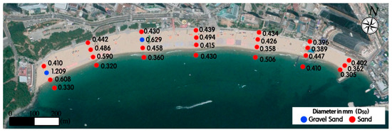 The grain size analysis of marine sediment is considered a basic tool in marine environmental research. The sand grain size distribution of the beach acts as a run-up for the waves and affects its morphology and slope, ultimately impacting the formation of rip currents. Therefore, twenty-one sand samples were collected using Van Veen grab, constituted by two jaws, to collect superficial sediments. The sampling criteria and instruments selected for marine sediments are generally functional for obtaining an undisturbed sample. Because the textural characteristics of sediments and their distribution are key factors in marine environmental research, great attention should be given to the accuracy of grain size distribution. The grain size analysis of marine sediments started with pretreatment. The saline content was removed by immersing the sample in distilled water, and the coarse and fine fractions were separated by wet sieving [10,11]. The sampling points are indicated by red and blue dots in Figure 3. For determining the size of sand particles in millimeters (mm), a phi scale was used, and the analyzed sand characteristics were then used as sediment input parameters in the numerical simulations. The sand grain size distribution showed an average particle diameter ranging from 0.305 to 1.209 mm, and fine (~0.25 mm) to medium (~0.5 mm) sand was dominant in the overall composition.