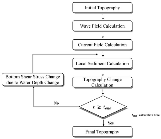 A numerical simulation was performed to identify the rip current flows by reproducing the current flows from waves near Haeundae Beach. Although various numerical models are available for reproducing current flows from waves, a 3-D Wave-Induced Current Numerical Model for predicting beach deformation was used to recreate and analyze the rip current patterns using wave-induced current flows. This model was developed by Watanabe and Maruyama [13], and it calculates wave-induced current using the calculated wave deformation by the equation of equilibrium [13]. A flow chart of the described model process is shown in Figure 5.