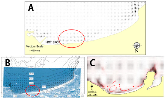 Results of the numerical simulations to predict hot spot of rip-current formation at Haeundae Beach (A): Present research, (B): Duguchi et al., 2008 [13], (C): Kim et al., 2013 [14].