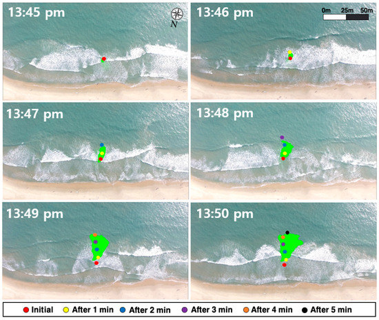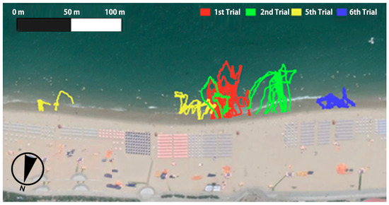 The buoy surveys at Haeundae Beach were conducted from June 1st to September 5th of 2019, which is the period when the beach is open for tourists during summer. The vicinity of the rip current hot spot was derived from the numerical simulations shown in Figure 6, and six trials of rip current surveys were conducted using five GPS drifters per trial. Each trial was conducted on a different date. A widely used Lagrangian method, recommended by the Korean Ministry of Ocean and Fisheries, was used to measure rip currents, and the results are plotted in Figure 7 [8].