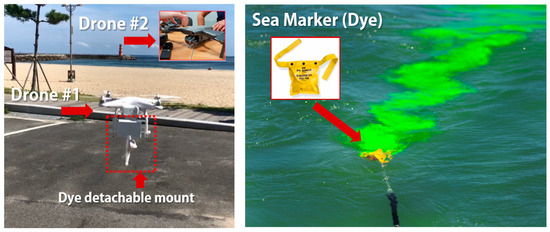 Fluorescent dyes are usually used in offshore rescue missions and are harmless to the human body; hence, they were used for the dye tracking investigation in this research. Based on the numerical simulation results, suspected areas of rip current occurrences were selected as the drone-shooting section, which is the rip current hot spot. After installing a mount that can be attached or detached to a drone, some dye was released at the desired spot. At this time, two drones (i.e., dye releasing and image shooting drones) were operated simultaneously for the investigation. Phantom 4 Pro drone manufactured by DJI, capable of up to 25 min of flight time and a receiver distance of 5 km, was used for the survey.