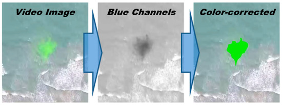 The aerial image of the fluorescein tracer dye in a rip current was taken via a drone, as shown in Figure 9, and the current velocity was calculated. After the video footage was corrected for distortions, images of this drone footage were captured at 1-min intervals and were color-corrected according to the dye concentration to identify the rip current flows. During correction, red, green, and blue (RGB) color channels were used for adjustment [21]. The white balance levels were preset by changing the white and grey areas using only blue channels to be able to clearly detect the fluorescein dyes, which changes the lighting conditions of the image [21]. During this process, the fluorescein dye was recolored for analysis. The dye survey was performed on 14 October 2019, at 13:45 for 5 min (Table 2, Figure 10).