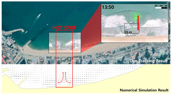 In general, when detecting the generation of rip currents, GPS drifters or buoys are used; however, various problems were discovered during the observation that resulted in low accuracy. As an alternative, a dye tracking methodology employing a drone was used in this study to measure and determine the location and movement paths of rip currents at a hot spot in Haeundae Beach. Wave-induced current numerical simulations with shallow water equations that incorporate radiation stress were performed to determine the characteristics of the rip currents. The results obtained from the numerical simulations were then compared with the result of the dye tracking method, and it was found that the observed result showed relatively sufficient reliability for rip current generation at the hot spot with a maximum instantaneous velocity difference of only 0.04 ms−1. In the future, if a method that allows the simultaneous observation of rip currents at multiple hot spots in front of the beach can be devised, it is expected that a more useful and practical rip current investigation system can be constructed.